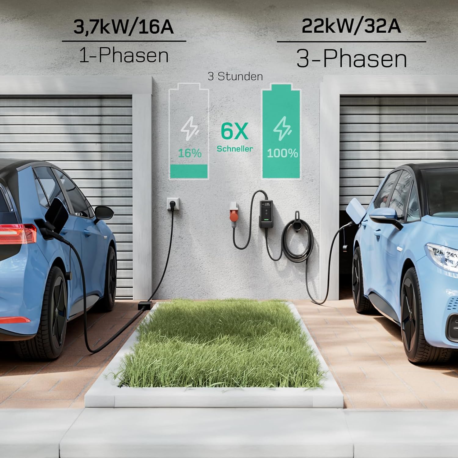 Datorită mufei CEE 32A trifazate, stația mobilă de încărcare oferă o putere maximă de 22 kW (230 V × 32 A × 3) – de până la 6 ori mai rapidă decât prizele casnice convenționale de 230 V × 16 A.